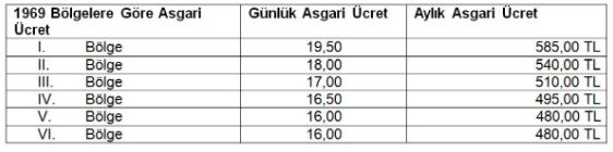 Asgari ücretin bölgesel olarak belirlendiği 1969 yılında tespit edilen ücretler şöyleydi: