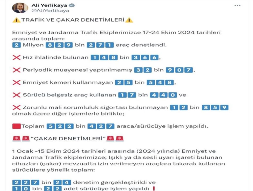 İçişleri Bakanı Ali Yerlikaya, 17-24 Ekim tarihleri arasında 2 milyon 829 bin 271 aracın denetlendiğini ve 522 bin 427 araca/sürücüye işlem yapıldığını duyurdu.
