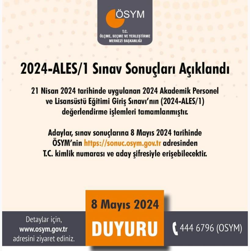 Ölçme, Seçme ve Yerleştirme Merkezi (ÖSYM), 2024 Akademik Personel ve Lisansüstü Eğitimi Giriş Sınavı (2024-ALES/1) sonuçlarının açıklandığını bildirdi.
