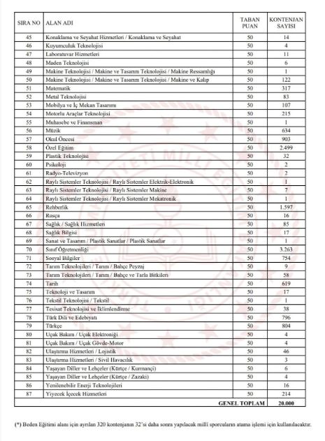Taban puan ve kontenjan tablosu da ilan edildi