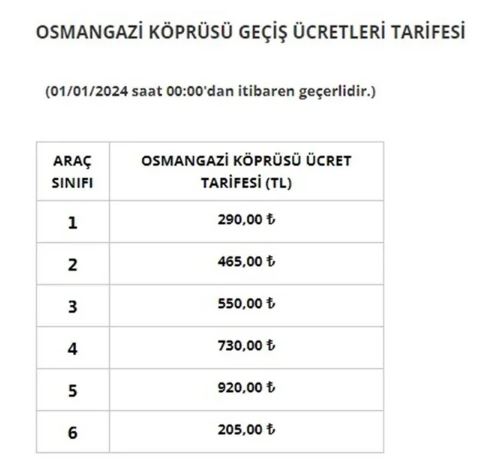YİD projelerine ait köprülerin otomobil için geçiş ücretleri ise; Osmangazi Köprüsü'nde 290 TL, 1915 Çanakkale Köprüsü'nde 295 TL, Yavuz Sultan Selim Köprüsü'nde 35 TL olarak belirlenmiştir.