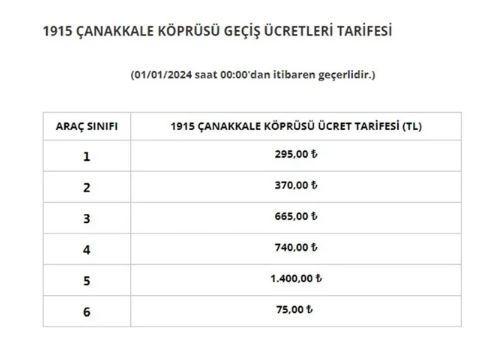 Buna göre, Karayolları Genel Müdürlüğü tarafından işletilen otoyollarda otomobil için en düşük geçiş ücreti 9 TL, en yüksek geçiş ücreti 84 TL, boğaz köprüleri tek yön otomobil geçiş ücreti ise 15 TL olarak belirlenmiştir.