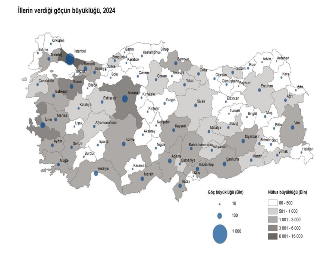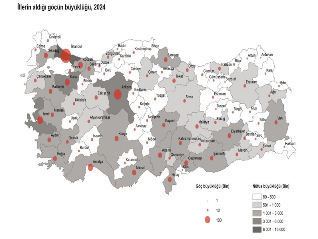 Açıklanan verilere göre, 2024 yılında Türkiye'de iller arasında 2 milyon 682 bin 673 kişi göç etti. Göç eden nüfusun yüzde 47,6’sı erkek, yüzde 52,4’ü kadınlardan oluştu. En fazla göç alan iller İstanbul, Ankara ve İzmir olurken, en az göç alan iller arasında Ardahan, Bayburt ve Tunceli yer aldı.