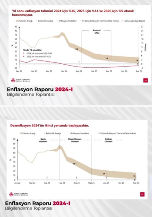 TCMB Başkanı Karahan'ın açıkladığı enflasyon tahminlerinin orta noktası; 2024 yıl sonu için yüzde 36, 2025 yıl sonu için yüzde 14 ve 2026 için yüzde 9 oldu.