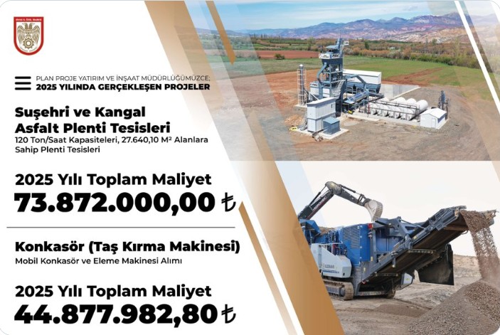 Bu kapsamda Suşehri ve Kangal ilçelerinde kurulan asfalt plent tesisleriyle, yol yapım ve bakım çalışmalarında önemli bir kapasite artışı sağlandı. Saatte 120 ton üretim kapasitesine sahip tesisler sayesinde toplam 27 bin 640 metrekarelik alanlarda hizmet verilecek. Asfalt plent tesislerinin 2025 yılı toplam maliyetinin 73 milyon 872 bin lira olduğu belirtildi.