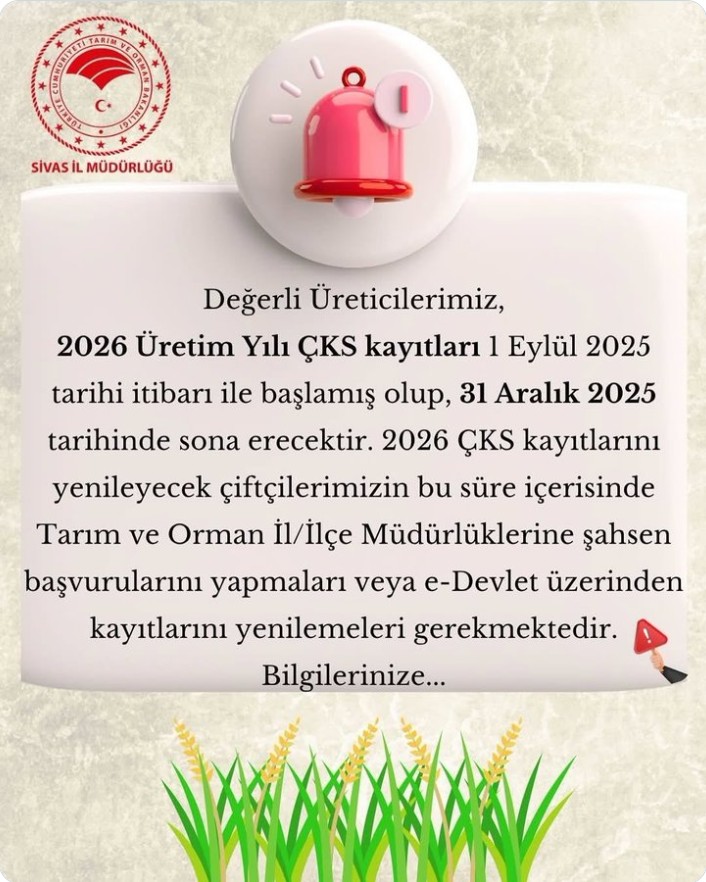 2026 ÇKS Kayıtları Başladı...Tarım ve Orman İl Müdürlüğü tarafından yapılan duyuruya göre, 2026 Üretim Yılı Çiftçi Kayıt Sistemi (ÇKS) başvuruları 1 Eylül 2025 tarihi itibarıyla başladı.