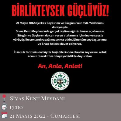 Kafkas Dernekleri Federasyonuna bağlı Sivas Kuzey Kafkas Kültür Derneği Başkanı Fatih Özdemir, 21 Mayıs 1864 Çerkes sürgün ve soykırımı hakkında açıklama yaparak, "bu sene hep beraber yüksel sesle ve ısrarla “BUNUN ADI SOYKIRIM” diyebilmek için 21 Mayıs’ta Sivas Kent Meydanı’ndayız!" dedi.