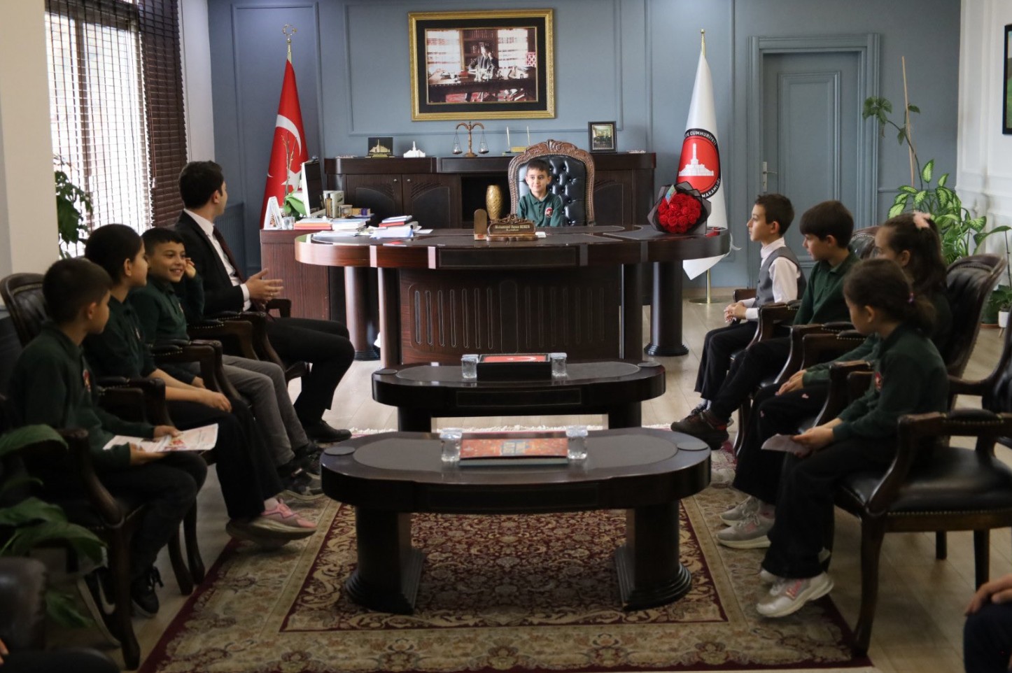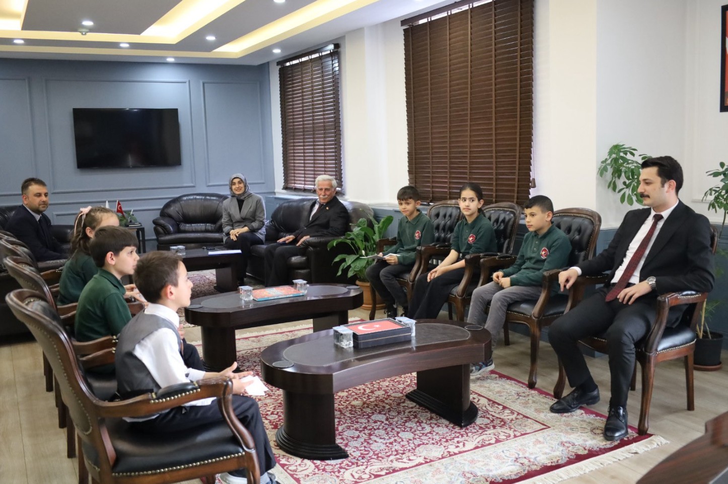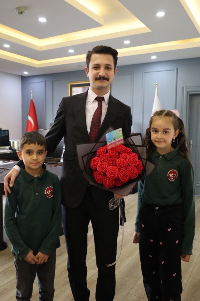 Kaymakam Muhammed Hasan Kukuş, Münire Mustafa Aydoğdu Yatılı Bölge Okulu öğretmen ve öğrencilerini makamında kabul etti. Ziyaret sırasında makam koltuğunu temsili olarak 4. sınıf öğrencisi Göktürk Sarıtaş’a devreden Kaymakam Kukuş, öğrencilerin bayram coşkusuna ortak oldu.