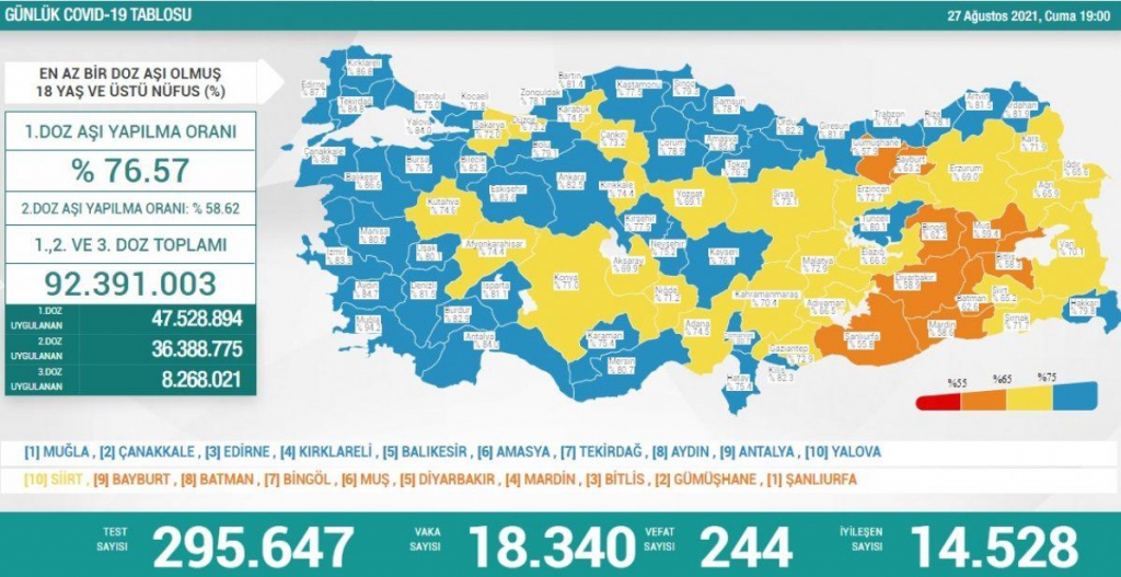 Türkiye'de 27 Ağustos Perşembe günü koronavirüs salgınında 18.340 yeni vaka tespit edilirken, 244 vatandaşımız da yaşamını yitirdi.