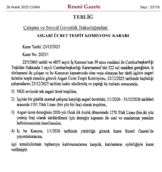 Resmi Gazete’de yayımlanan karara göre, 1 Ocak 2026 tarihinden itibaren geçerli olmak üzere asgari ücret brüt ve net tutarları yeniden düzenlendi. Yapılan düzenleme ile asgari ücret 28 bin 75 lira olarak uygulanacak.
