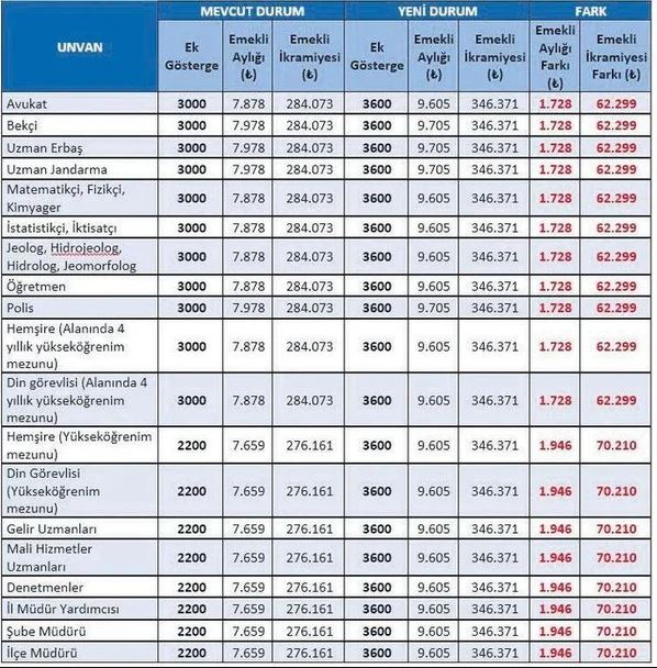 Ek göstergesi 2200'den 3600'e yükseltilen sağlık çalışanları, din görevlileri, denetmen ve şube müdürü gibi memurların ise emekli aylıklarında 1946 lira, ikramiyelerinde 70 bin 210 lira ilave ödeme olacak.