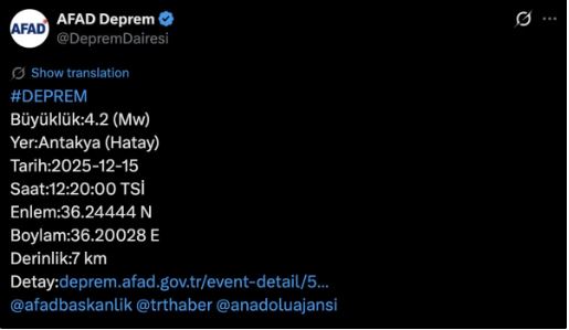 Afet ve Acil Durum Yönetimi Başkanlığı (AFAD) verilerine göre, deprem saat 12.20’de kaydedildi. Merkez üssü Antakya olan depremin yerin yaklaşık 7 kilometre derinliğinde gerçekleştiği bildirildi.