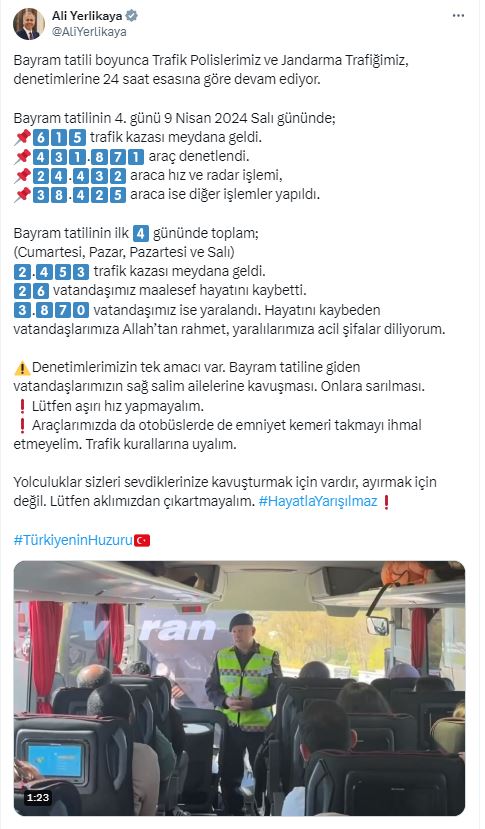 İçişleri Bakanı Ali Yerlikaya, Ramazan Bayramı tatilinde yollardaki son duruma ilişkin paylaşımda bulundu.