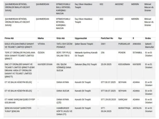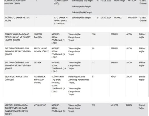 Güncellenen listede özellikle et ürünleri dikkat çekti. Antalya, Adana, Karaman ve Kayseri’deki bazı işletmelerde kebap, köfte, sucuk ve etli ekmek gibi ürünlerde baş eti, taşlık ve kalp eti gibi sakatatların kullanıldığı belirlendi. Bazı örneklerde dana kıymaya kanatlı eti karıştırıldığı da tespit edildi.