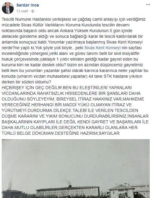 Açıklamanın tamamı şu şekilde: "Tescilli Numune Hastanesi yerleşkesi ve çağdaş camii anlayışı için verdiğimiz mücadele Sivas Kültür Varlıklarını Koruma Kurulunda tescilin devamı noktasında başarılı oldu, ancak Ankara Yüksek Kurulunun 5 gün içinde alelacele gündeme aldığı ve sonuca bağladığı karar ile tescili kaldırılarak bir anlamda sonuçsuz kaldı.