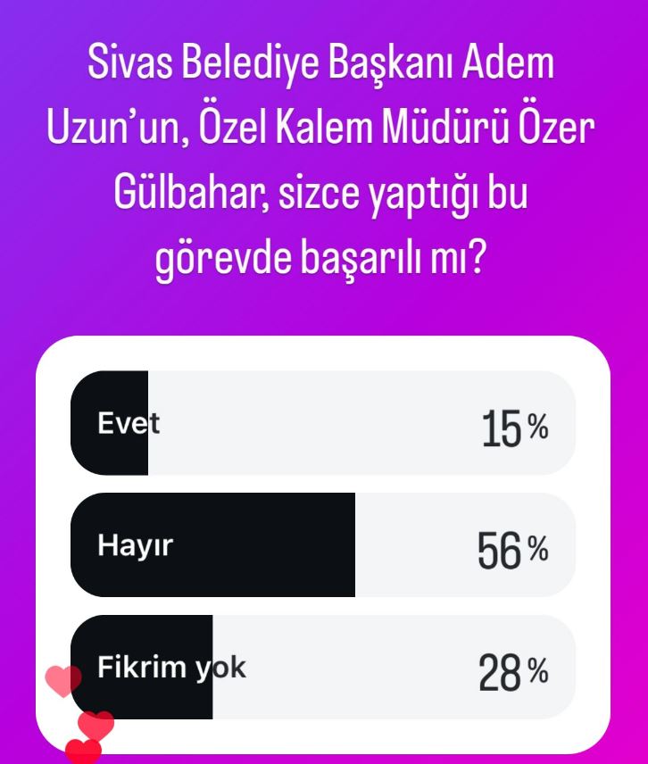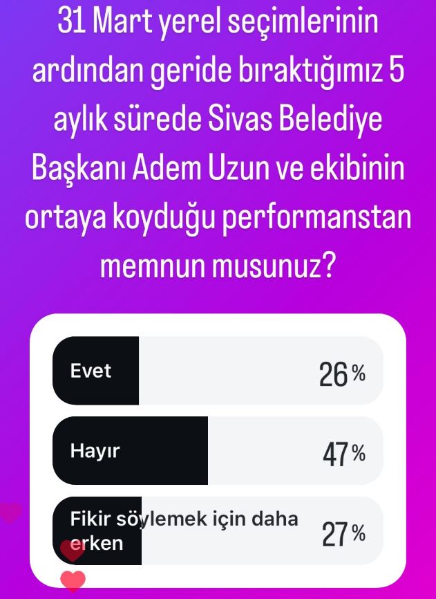 Büyük Sivas tarafından dün başlatılan ve yaklaşık 10 bin kullanıcının katıldığı anketin sonuçlarına göre, geride kalan 5 aylık sürede Sivas Belediye Başkanı Adem Uzun’un performansından memnun olanların oranı sadece yüzde 26 oldu.