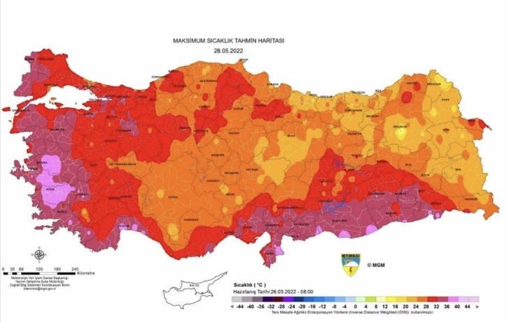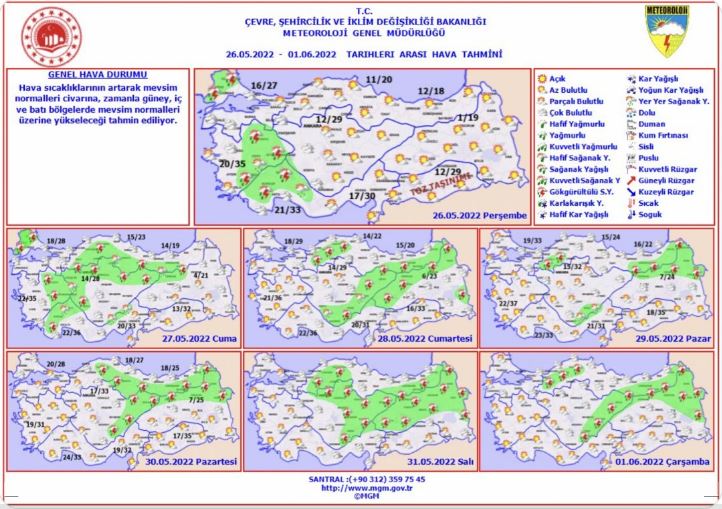 Günün en yüksek hava sıcaklıklarının, İstanbul'da 27-33, Edirne'de 32-35, Bursa ve Balıkesir'de 33-38, Sakarya'da 32-37, İzmir'de 35-37, Manisa'da 36-39, Aydın'da 38-40, Antalya'da 33-36, Düzce'de 32-37 derece civarında seyredeceği tahmin ediliyor.