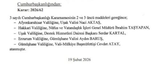 Karara göre Afyonkarahisar, Uşak, Hakkari, Erzurum ve Gümüşhane illerine yeni valiler atanarak yönetim kadrolarında değişiklik gerçekleştirildi. Atama kararları kapsamında merkezi yönetimde de görev değişiklikleri dikkat çekti.