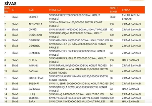 Sivas merkez başta olmak üzere Altınyayla, Divriği, Doğanşar, Gemerek, Gürün, İmranlı, Kangal, Koyulhisar, Suşehri, Şarkışla, Ulaş, Yıldızeli ve Zara ilçelerini kapsayan projelerde kura heyecanı yaşanıyor. İl genelinde farklı ilçe ve mahallelerde yapılacak konutlarla dar gelirli vatandaşların konut ihtiyacının karşılanması hedefleniyor.
