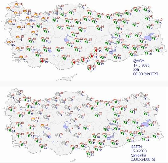 "Deprem bölgesinde, Pazar gününden itibaren beş gün aralıklarla sağanak ve yer yer gök gürültülü sağanak yağış bekleniyor. Yağışların deprem bölgesindeki bütün illerimizde pazartesi, salı ve çarşamba günleri yer yer kuvvetli olacağı tahmin ediliyor. Rüzgarın; cumartesi gününden itibaren Malatya, Elazığ ve Kahramanmaraş'ta, pazar gününden itibaren Diyarbakır, Şanlıurfa ve Adıyaman'da güney yönlerinden kuvvetli, yer yer fırtına şeklinde esmesi bekleniyor. Sıcaklığın; deprem bölgesindeki illerde bir haftalık periyotta mevsim normallerinin üzerinde seyredeceği tahmin ediliyor. Toz taşınımının deprem bölgesindeki illerimizde, cumartesi akşam saatlerinden itibaren etkili olması beklenmekte olup, Şanlıurfa, Mardin, Elazığ, Malatya, Diyarbakır ve Adıyaman'da yer yer kuvvetli olacağı tahmin ediliyor. Toz taşınımının sebep olacağı toz fırtınası, çamur şeklinde yağış, ulaşımda aksamalar, hava kalitesinde düşme ve görüş mesafesinde azalma gibi olumsuzluklara karşı dikkatli ve tedbirli olunmalıdır"