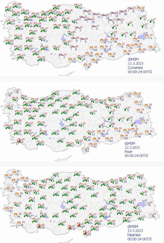 Cumartesi Marmara, Ege, Batı Akdeniz, İç Anadolu'nun kuzeybatısı ve Batı Karadeniz'de, pazar Ege, Batı ve Orta Akdeniz, İç Anadolu ve Batı ve Orta Karadeniz'de, pazartesi Akdeniz, İç Anadolu, Batı ve Orta Karadeniz ve Güneydoğu Anadolu ile Doğu Anadolu'nun batısında beklenen yağışların yer yer kuvvetli olacağı öngörülüyor.