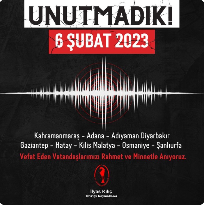 Divriği Kaymakamı İlyas Kılıç adına paylaşılan anma mesajında, depremde hayatını kaybeden tüm vatandaşların rahmetle anıldığı, geride kalan ailelere sabır ve başsağlığı dileklerinin iletildiği ifade edildi. Mesajda ayrıca, böyle acıların bir daha yaşanmaması temennisiyle, toplumsal farkındalığın ve afet bilincinin canlı tutulmasının önemine vurgu yapıldı.