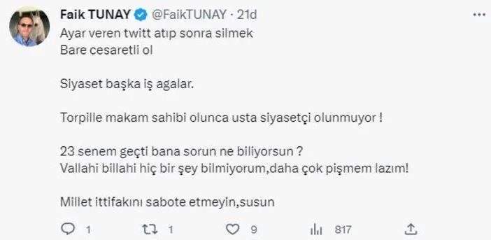 "Ayar veren twitt atıp sonra silmek Bare cesaretli ol Siyaset başka iş agalar. Torpille makam sahibi olunca usta siyasetçi olunmuyor ! 23 senem geçti bana sorun ne biliyorsun ? Vallahi billahi hiç bir şey bilmiyorum,daha çok pişmem lazım! Millet ittifakını sabote etmeyin,susun"