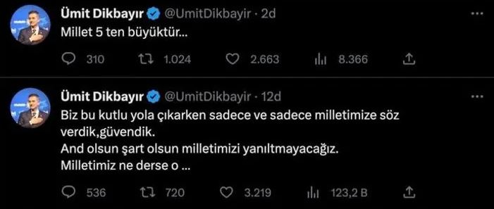 İyi Parti Sakarya Milletvekili Ümit Dikbayır sosyal medyadan yaptığı "Millet 5'ten büyüktür" yorumunu kısa bir süre sonra sildi.