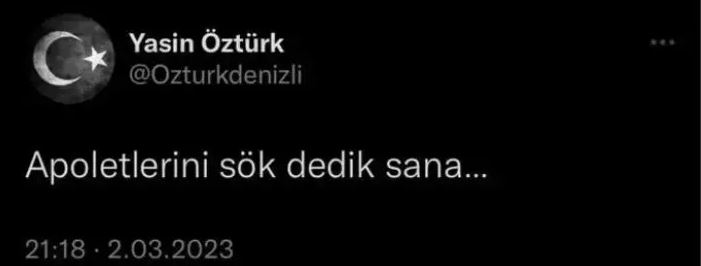 İYİ Parti Kurucular Kurulu üyesi Yasin Öztürk'ün, Kılıçdaroğlu'na attığı olarak yorumlanan tweette ise "Apoletlerini sök dedik sana…" ifadesi yer aldı.