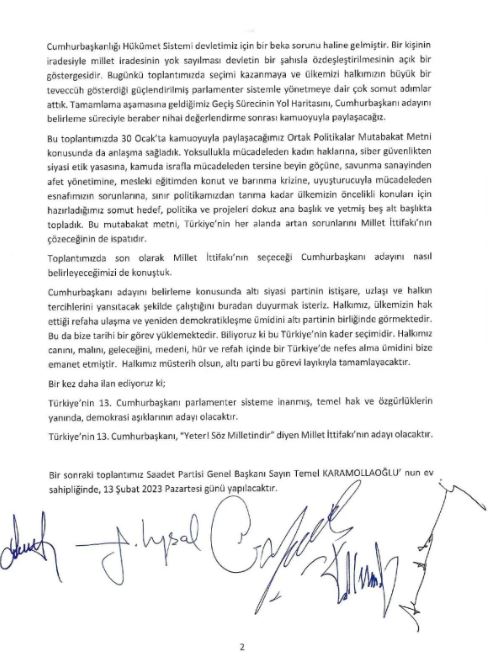 Son dakika gelişmesi... Altı siyasi partinin genel başkanı; İYİ Parti Genel Merkezi'nde bir araya geldi. Yapılan açıklamada, "Türkiye'nin 13. Cumhurbaşkanı 'Yeter' Söz Milletindir' diyen Millet İttifakı'nın adayı olacaktır" ifadelerine yer verildi.