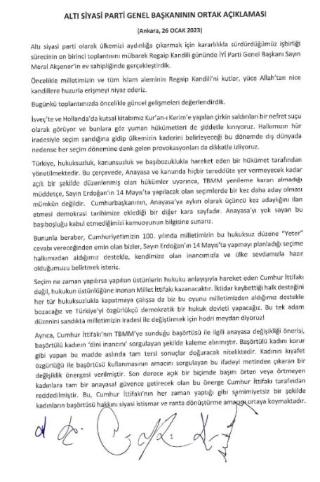 6'lı Masa'dan ortak açıklama: Erdoğan'ın 3. kez adaylığını kabul etmiyoruz!