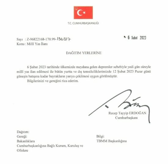 Yaşanan deprem felaketinin ardından 7 gün milli yas ilan edildi.