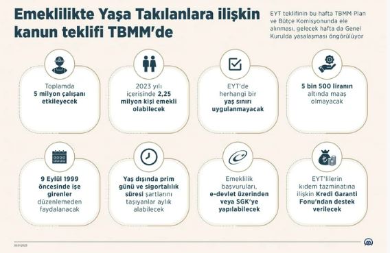2 milyon 250 bin kişinin yararlanması beklenen EYT düzenlemesinin en geç haftaya salı veya çarşamba günü yasalaşacağını açıklandı.