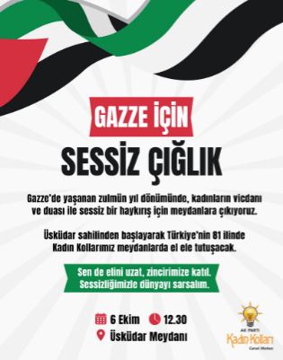 AK Parti Kadın Kolları Genel Başkan Yardımcısı ve Sivil Toplum ve Halkla İlişkiler Başkanı Rukiye Toy, 6 Ekim Pazartesi günü gerçekleştirilecek olan “Gazze İçin Sessiz Çığlık” etkinliğine tüm kadınları davet etti.