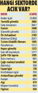 Türkiye genelinde işveren, İŞKUR üzerinden 93 bin 255 eleman arıyor. Bunun 22 bin 868’i beden işçisi, yani ‘vasıfsız’ işçi. 70 bin 357’si ise gıdadan tekstile, inşaattan otomotive birçok alanda işçi arayışını içeriyor.