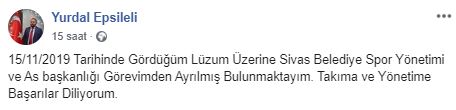Kısa süre önce yeni yönetimle birlikte yapılan kongre neticesinde göreve seçilen ve Sivas Belediyespor as başkanlığı görevini yürüten Yurdal Epsilel i sosyal medya hesabından yaptığı açıklamayla görevinden istifa ettiğini duyurdu.