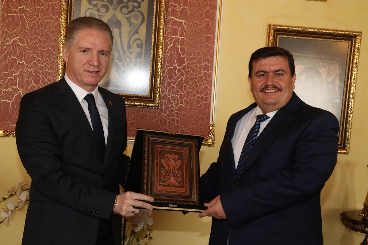 Vali Arslantaş ilk olarak şeref defterini imzaladı. Ardından Vali Gül, Arslantaş'a çift başlı kartal motifli tablo hediye etti.