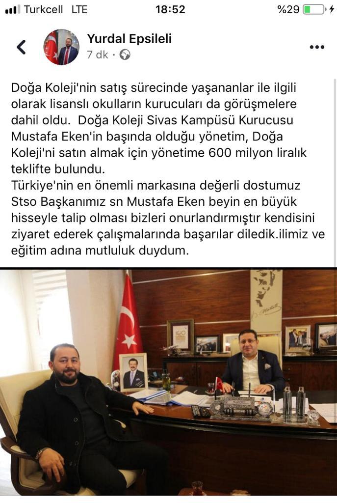 Epsileli sosyal medya hesabından "Doğa Koleji'nin satış sürecinde yaşananlar ile ilgili olarak lisanslı okulların kurucuları da görüşmelere dahil oldu. Doğa Koleji Sivas Kampüsü Kurucusu Mustafa Eken'in başında olduğu yönetim, Doğa Koleji'ni satın almak için yönetime 600 milyon liralık teklifte bulundu.