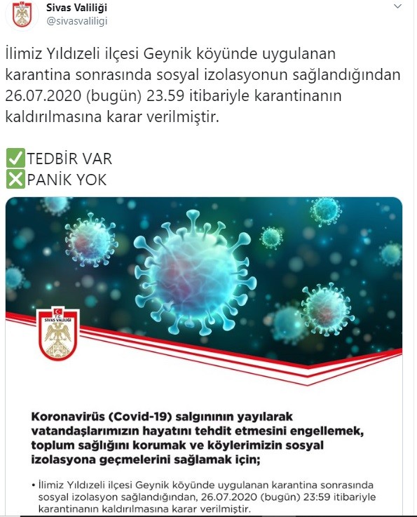 Sivas Valiliğinden yapılan açıklamada, “İlimiz Yıldızeli ilçesi Geynik köyünde uygulanan karantina sonrasında sosyal izolasyonun sağlandığından 26.07.2020 (bugün) 23.59 itibarıyla karantinanın kaldırılmasına karar verilmiştir“ ifadelerine yer verildi. (İHA)