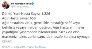 "Dünkü yeni hasta sayısı: 1.226, ağır hasta sayısı: 656. Ağır hastalara virüs, genellikle, hastalığı hafif veya belirtisiz yaşayanlardan geçiyor. Ağır hastaların neler yaşadığını, yaşamadan bilemezsiniz. Sıcak da olsa maskenizi takın, zorlansanız da mesafe kuralına uymaya çalışın." -TRThaber