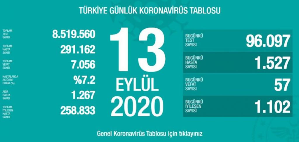 Bakan Koca tabloyu, "57 can kaybı, 1.527 yeni hasta. Virüs sevdiklerimizi bizden ayırıyor. Bu gidişe dur diyecek olan Birlik ve Beraberlik içinde mücadeledir. tedbirde birlik olalım virüse fırsat vermeyelim." ifadeleriyle paylaştı.