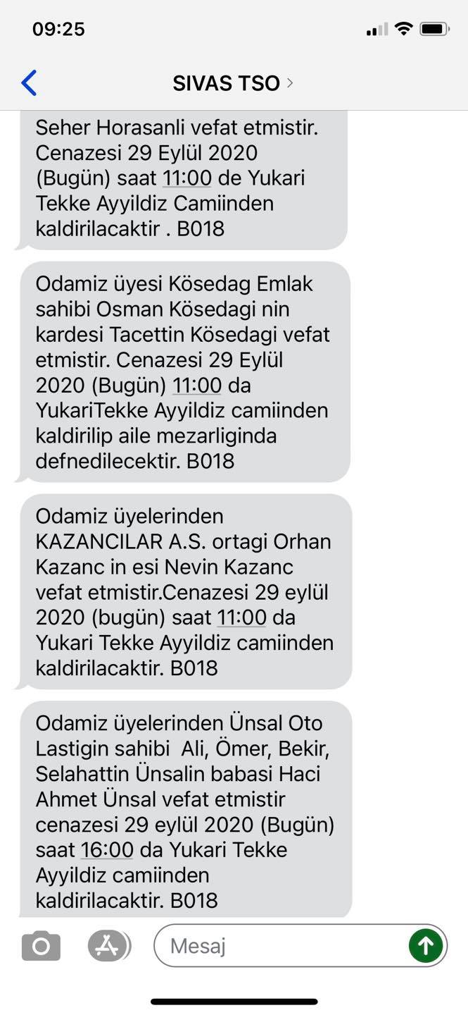 Sivas Ticaret ve Sanayi Odası'ndan üyelerine düzenli olarak vefat mesajlarına sabah saatlerinde 4 kişi daha eklendi.