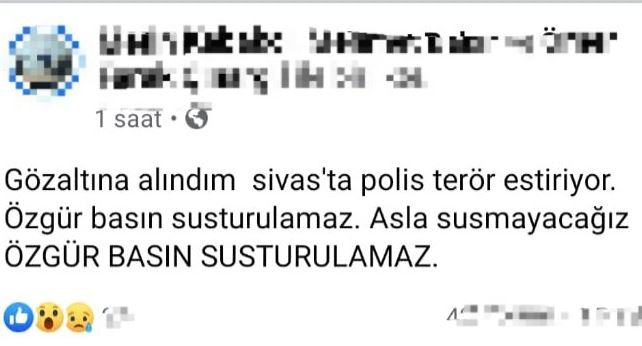 Sivas İl Emniyet Müdürlüğü müvekkilin "özgür basın susturulamaz" şeklindeki sosyal medya mesajını yayınlayarak konunun basınla ilgisinin olmadığını iddia etmiş ise de müvekkil kollukta ve kolluğa götürülürken, kendisinin tv kanallarında programcı olduğunu, bir kaç saat sonra canlı yayın programı olduğunu, ceza yazılacak yahut ifadesine başvurulacaksa bunu programdan sonra yapmaları gerektiğini defaten polis memurlarına söylemiş fakat müvekkilin talebi dikkate alınmamış, gözaltı kararı olmamasına rağmen kolluktan ayrılmasına müsaade edilmemiştir.
