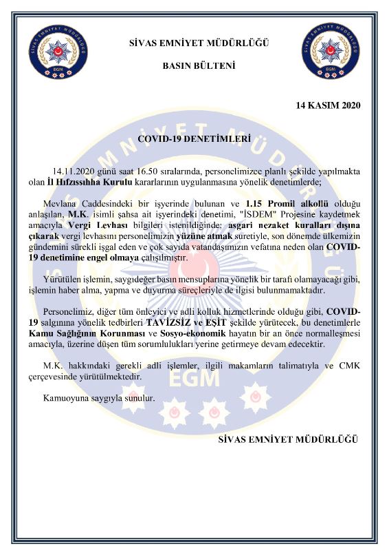 Sivas İl Emniyet müdürlüğü yapmış olduğu açıklamada, personellerinin tüm önleyici ve adli kolluk hizmeti ile COVİD 19 salgınına yönelik tedbirleri TAVİZSİZ VE EŞİT şekilde yürüttüğünü iddia etmiştir.