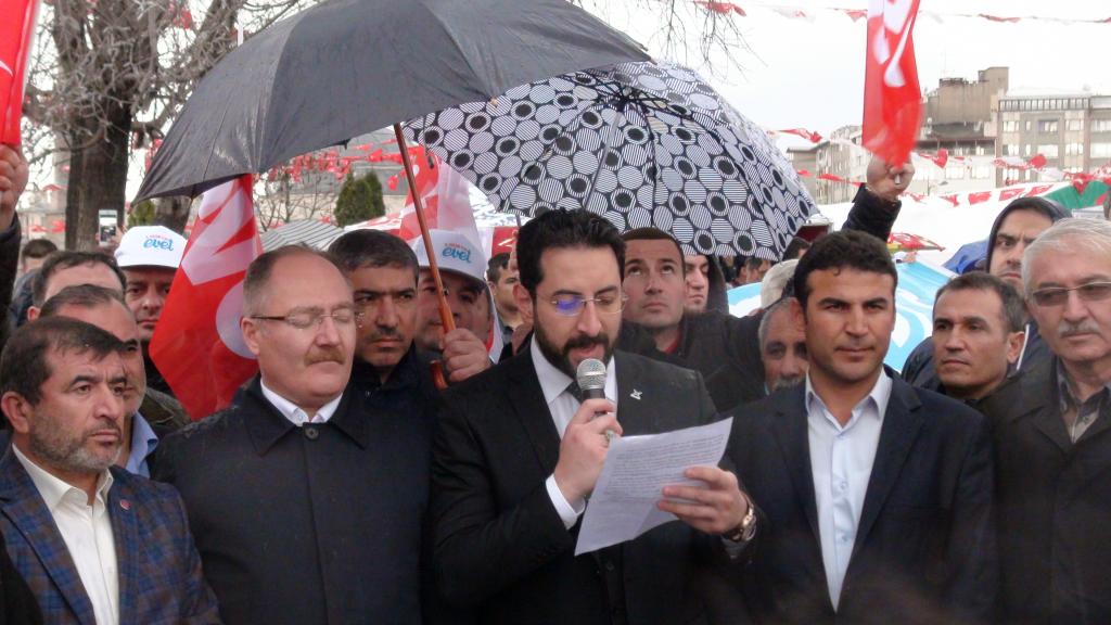 Kent Meydanında son bulan yürüyüş sonunda basın açıklaması yapan TÜGVA Sivas İl Temsilcisi Erhak Çınar, “Öncelikle, milletimizin kaderini tayin edileceği tarihi sayılı günler kala, iç ve dış düşmanlarımıza ülkemize sahip çıktığınız için “Evet” diye haykıran siz vatan sevdalılarına şükranlarımızı sunuyoruz” diyerek şu ifadelere yer verdi: