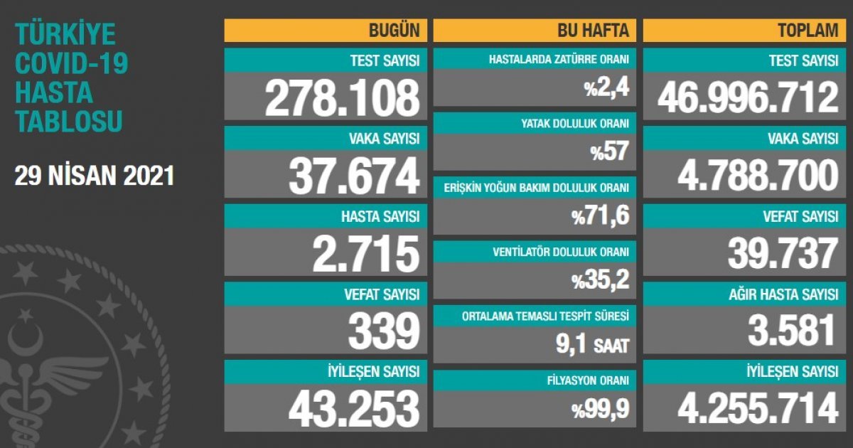 Koronavirüsle mücadele kapsamında tam kapanma uygulamasının başladığı 29 Nisan tarihinde, Türkiye'de günlük vaka sayısı 37 bin 674 idi, 339 kişi de hayatını kaybetmişti.