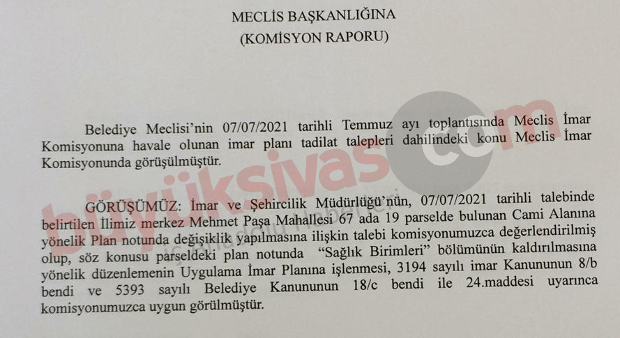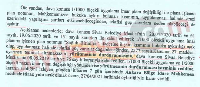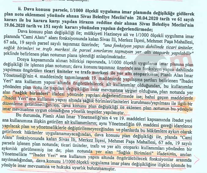 Sivas İdare Mahkemesinin 2020/564 esas numaralı kararında "1/1000 ölçekli uygulama imar planına işlenen plan notunun "Sağlık Birimlerine" ilişkin plan kısmının hukuka aykırılığı açık olup, uygulanması halinde telafisi güç zararlar doğabileceğinden..." denildi.