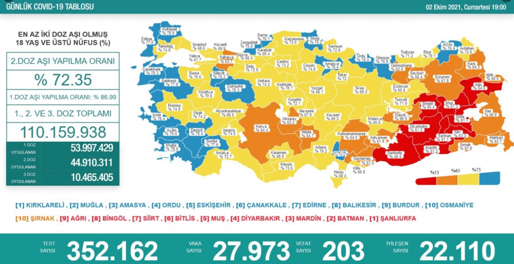 2 Ekim Cumartesi Türkiye Günlük Koronavirüs Tablosu