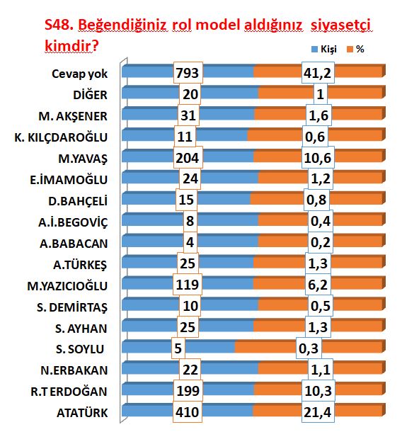 Gençler % 40 oranında beğendiği ve rol model aldığı bir isim olmadığını ifade ederken en fazla rol model alınan kişiler sırasıyla Mustafa Kemal Atatürk, Mansur Yavaş ve Recep Tayyip Erdoğan olarak ortaya çıktı.