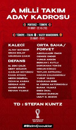 A Milli Takım Teknik Direktörü Stefan Kuntz tarafından belirlenen 27 kişilik kadroda şu futbolcular yer aldı: